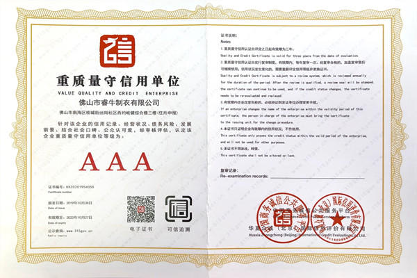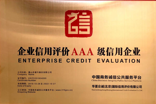 佛山市睿牛制衣有限公司——3A級質(zhì)量服務(wù)誠信單位;
