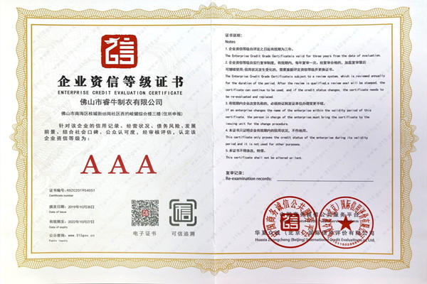 佛山市睿牛制衣有限公司——3A級企業(yè)資信等級證書;