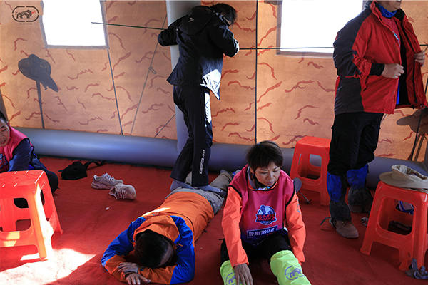 傍晚達到營地,每個人都風塵仆仆,脫下襪子腳腫了一圈,有的襪子被血水模糊了,撕下來淚水隱忍而出。看著周邊的同伴,原以為她自己情況是最慘的,但不知團隊里有人原本就膝蓋痛,有的人發燒,有的人也來例假,有的人近240斤仍不懈前行,有的人比自己還要高齡也不放棄。